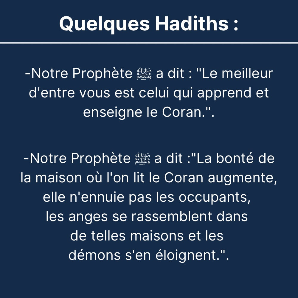 Apprenez le Coran à vos enfants en leurs faisant écouter tous les soirs. Dans un hadith notre Prophète ﷺ a dit : "Le meilleur d'entre vous est celui qui apprend et enseigne le Coran.".